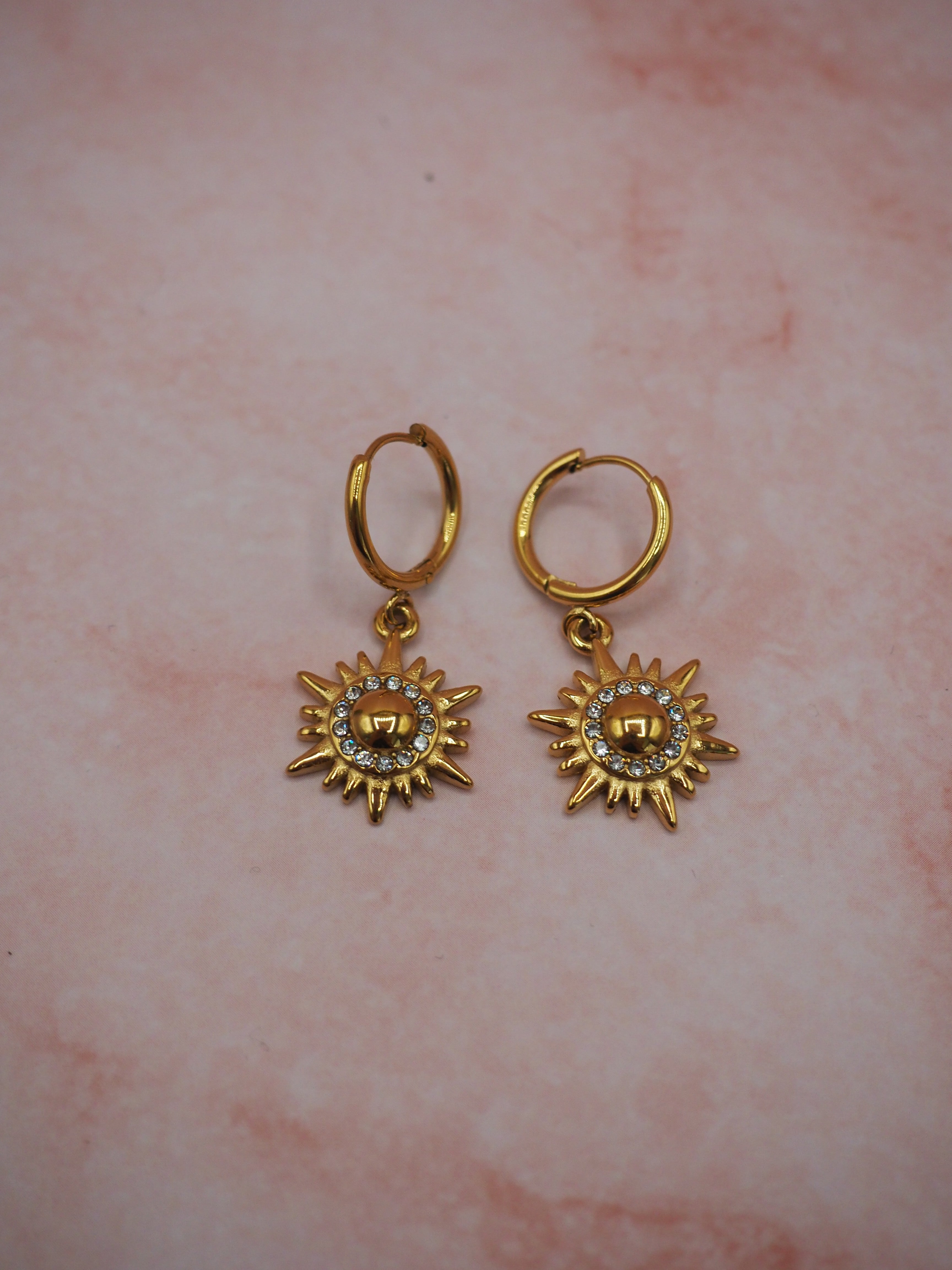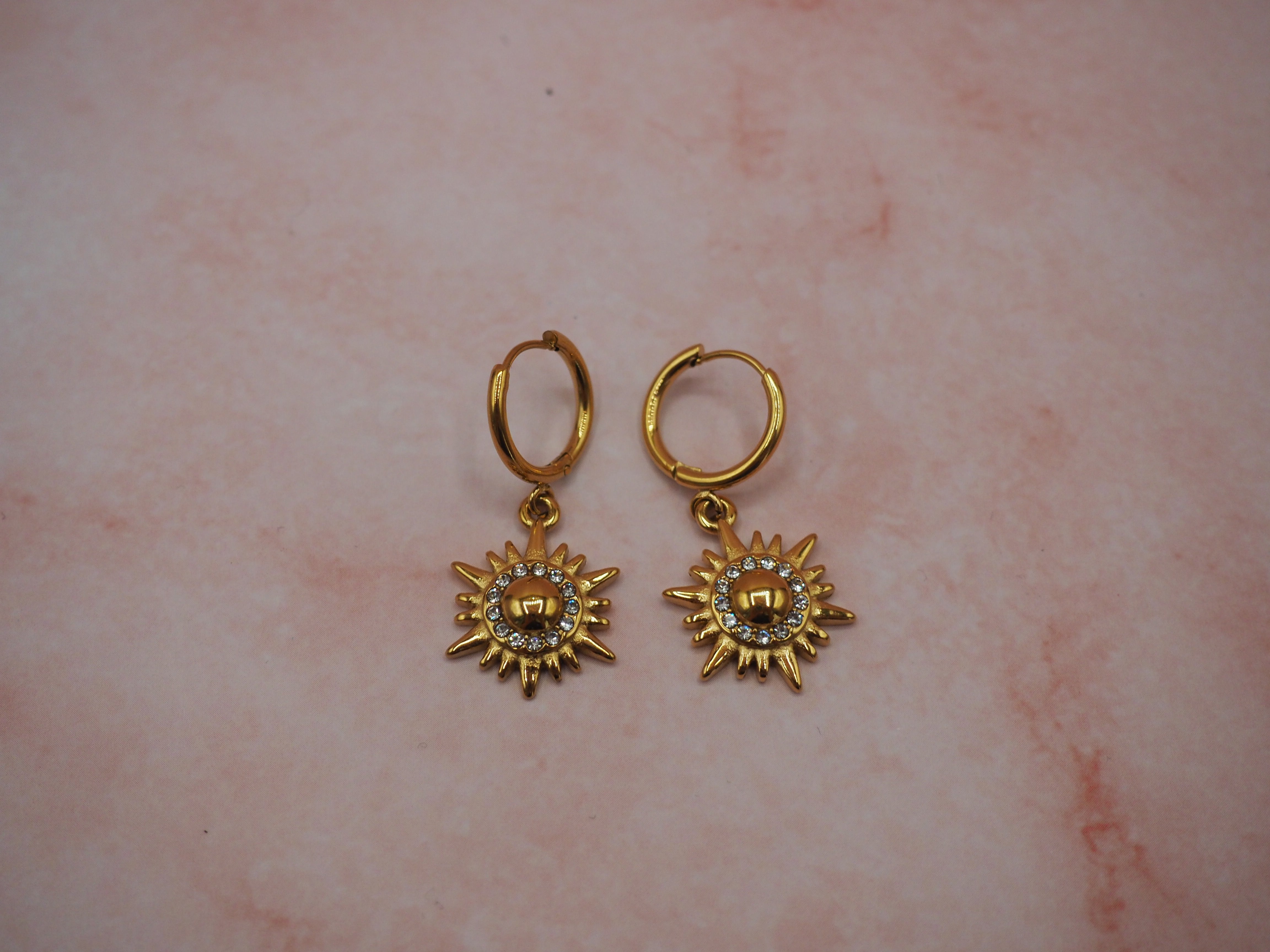 CRISTINA – 18K vergulde oorbellen met zonhanger en zirkonia | Gouden hoops vrouw | Symbolisch & sprankelend design
